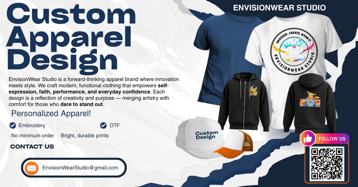 Welcome to Envisionwear Studio, where fashion meets individuality and every design tells a story. We curate a thoughtfully crafted T-shirt and apparel collection that celebrates unique style, embraces diversity, and empowers you to express your true self with confidence. Our garments seamlessly blend quality, comfort, and trend-forward design—so you can make a bold statement with every step you take.Driven by creativity, craftsmanship, and cutting-edge techniques—including embroidery, DTF (Direct-to-Film), and HTV vinyl—we create apparel that is as expressive as it is durable. From concept to completion, each piece is handled with care, ensuring high-quality, custom-made designs that bring your vision to life.